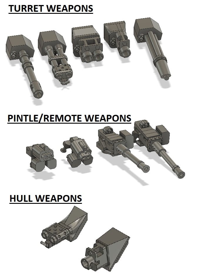 The model has been designed from the beginning to be as modular as possible. Slots have been placed to allow for the hull-mounted weapon, the turret weapon, searchlight (open and closed versions), auger array, hunter-killer missile, pintle/RWS weapons, and dozer blade to be attached to the hull/turret with 2mm*1mm rare earth magnets. Applique, spaced, and bar additional armour is a push-fit part that can be added or removed as needed, no magnets required.
